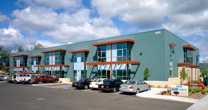 The designers of this office and warehouse facility used ribbed wall panels and a standing seam roof. For decorative purposes, tube framed pop outs and canopies were used. The offices are 2-story.