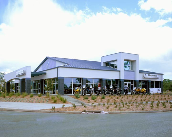 This metal building is used for motorcycle sales and service. The designers used dormers and gambrel roofs to give the building character. Radiant floor heating provides comfortable room temperature during the winter. To catch attention, a tower is on the street side of the building above the showroom.