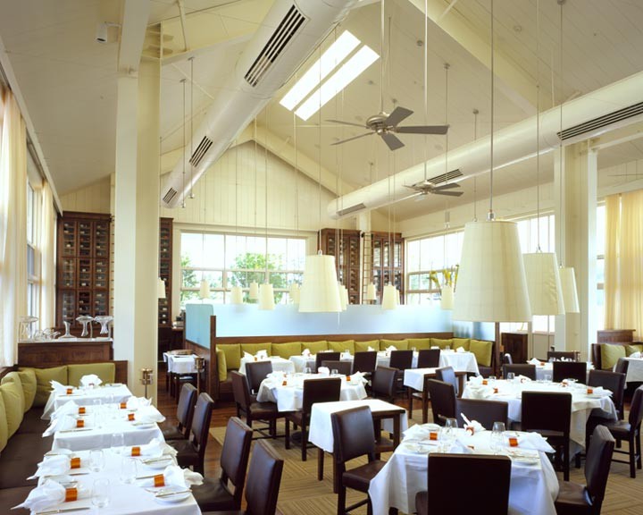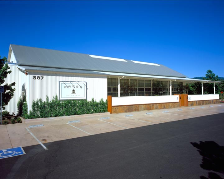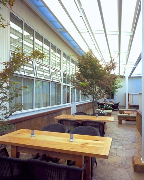To maximize the amount of natural light in the building, translucent corrugated fiberglass panels were installed in the court yard roof along with custom ridge skylights. "Pre-Aged" corrugated galvalume roof panels were used to create a vintage looking building. A 6:12 roof pitch over the dining area has purlins raised above the rafters to accommodate the wood ceiling application.